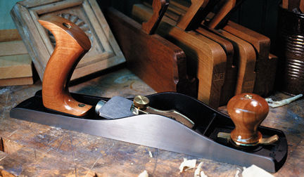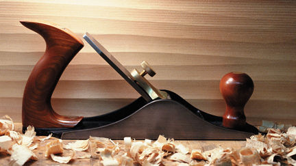 | I used a variety of hand and hand held power tools for this project. Especially helpful was my new Lie-Nielsen scrub plane which was used to remove most of the stock from the pencil legs. This was after I bought, used and destroyed a power planer. The power planer has a spinning blade in a body much like the scrub plane at the left - it is sort of a combination of a power planer and a router. Anyway, I managed to get the power cord in between the work and the blade and it sliced through its own cord like nothing (except for the big blue POP!). This scared me sufficiently to go back to hand tools. This plane here is expensive but it takes wood down very, very fast. Easy to control and very accurate - it has a very open throut and a convex plane iron which makes a scalloped cut. Highly recommended. |